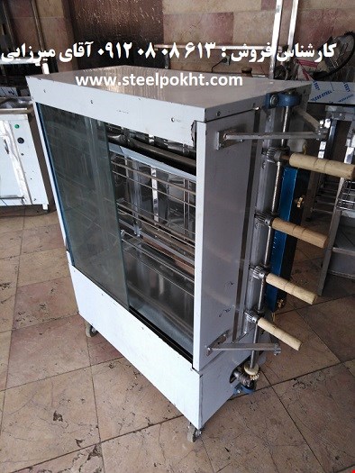زیر سیخ های فر مرغ بریان یک سینی با ورق استیل جهت ریخته شدن آب و روغن مرغ به کار رفته است.