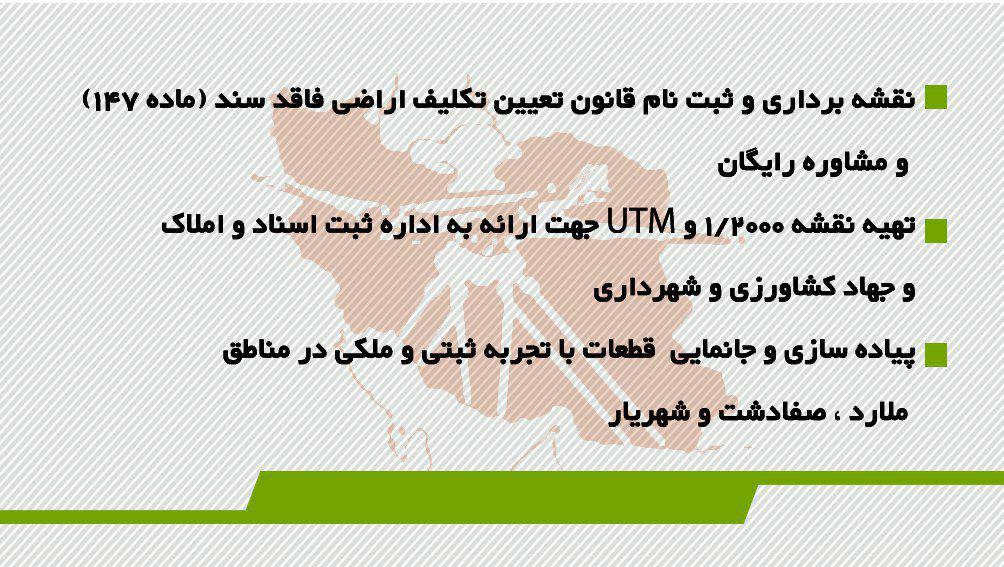 ثبت رایگان آگهی نقشه برداری , UTM در تهران وکرج و حومه توسط مهندس نقشه بردار با تجربه ثبتی و ملکی در منطقه . نقشه برداری ، تهیه نقشه توپومتری و توپوگرافی و محاسبه حجم عملیات خاکبرداری و خاکریزی ، تفکیک و طراحی عرصه ، پیاده سازی (جانمایی) املاک ، بر و کف ، تهیه پلان معماری ، تعیین قدمت بنا و ... ، UTM جهت اداره ثبت اسناد و املاک ( تکبرگی و .... ) ، شهرداری ، جهاد کشاورزی ، شرکت گاز ، نقشه برداری و ثبت نام قانون تعیین تکلیف اراضی فاقد سند ( 147 ) و مشاوره در خصوص اخذ سند ملک و ... در صورت نیاز با مهر کارشناس نقشه برداری و کارشناس رسمی دادگستری شماره تلفن 09195854124