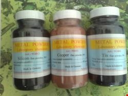پودر آهن،پودرآلومینیم،پودرتنگستن و تنگستن کارباید ،بور کارباید، پودر تیتانیم و تیتانیم کارباید،پودر روی،پودر زیرکونیم،پودر سرب،پودر سلنیوم،پودر سیلیسیم و سلیکون کارباید،پودر قلع،پودر کبالت،پودر کروم،پودر مس،پودرمنگنز،پودر منیزیم،پودر مولیبدن،پودر نقره،پودر نیکل و فلزهای سدیم ،پتاسیم،کلسیم ،لیتیم و جیوه و همچنین انواع اکسید فلزات با خلوصهای 99 و 99.9% از معتبرترین تولید کنندگان جهان در بسته بندیهای 50 ، 100 ، 250 ، 500 گرمی و 1 کیلویی جهت مصارف آزمایشگاهی ، تحقیقاتی و دانشگاهی و همچنین در پکیج های بزرگتر جهت مصارف صنعتی موجود است .