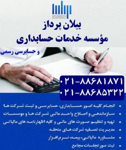 ثبت اسناد حسابداری، اصلاح و به روز رسانی حسابها ، تهیه صورتهای مالی ، با استفاده از بهترین نرم افزارهای حسابداری ، تهیه و ارائه گزارشات خرید و فروش فصلی و ارزش افزوده ، تهیه و ارائه اظهارنامه مالیاتی عملکرد، اعزام حسابدار و مدیر مالی بصورت پاره وقت ، تمام وقت و پروژه در تهران ، کرج ، اصفهان ، شیراز ، قزوین ، همدان و شهرکهای صنعتی