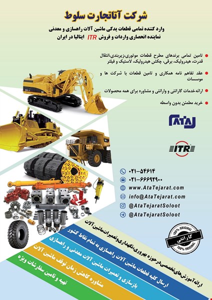 ثبت رایگان آگهی مفتخریم اعلام نماییم، شرکت آتاتجارت سلوط تنها نماینده رسمی محصولات ITR ایتالیا در ایران با بیش از نیم قرن تجربه در زمینه واردات قطعات یدکی ماشین آلات غول پیکر معدنی و راهسازی از قبیل بیل مکانیکی، بلدوزر، لودر، گریدر،دامپتراک ، غلطک، لیفتراک، دریل واگن