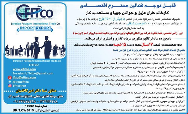 ثبت رایگان آگهی شرکت بین المللی افیتکو، صادرات، واردات، مشاوره سرمایه گذاری و شغلی، نصب و راه اندازی انواع خطوط تولید همراه با طرح توجیهی با فرمت یونیدو، سرمایه گذاری در بورس، اشتغال زایی، آموزش کلیه دوره های بازرگانی و ورود به بازارهای جهانی،....