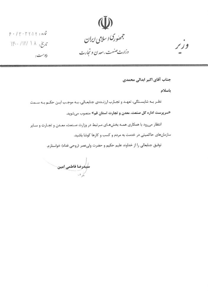 مسئول کارگروه اقتصاد مقاومتی سازمان صمت قم، کارشناس مسئول صنایع معدنی سازمان صمت قم، دبیر کمیته تخصصی توسعه ساخت سازمان صمت قم، عضویت در انجمن مدرسان اقتصاد مقاومتی کشور، عضویت در کارگروه اقتصاد مقاومتی حوزه علمیه قم، تدریس در دانشگاه و تالیف سه کتاب در حوزه اقتصاد مقاومتی از جمله کتاب «اقتصاد مقاومتی؛ تفسیر جهاد کبیر» و دهها مقاله اقتصادی بخشی از سوابق سرپرست جدید سازمان صنعت، معدن و تجارت استان قم است.