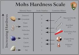 تست سختی – کانیها در محدوده 1 تا 10 مقیاسبندی میشوند که 1 نرمترین و 10 سختترین است. روش تعیین سختی تست خراش است.