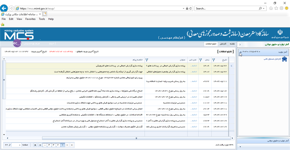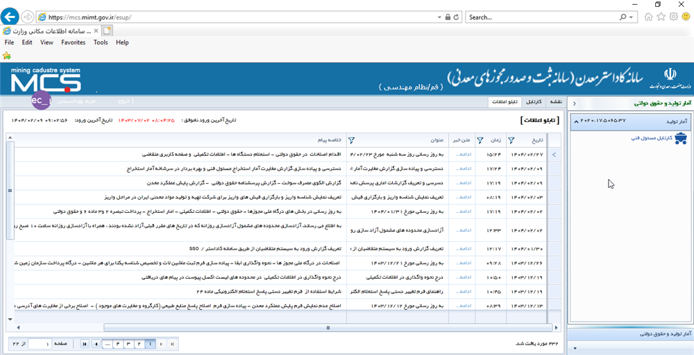 ب-در کارتابل مسئول فنی معدن- اطلاعات مربوط به بهرهبردار، ذخیره قطعی، ذخیره احتمالی، نوع زنز سنگ، استخراج سالیانه، کد آیسیک و درجه خلوص معدن ثبت شده و در بعضی موارد عیار حد هم اعلام می گردد.که برای مسئول فنی قابل بررسی می باشد.