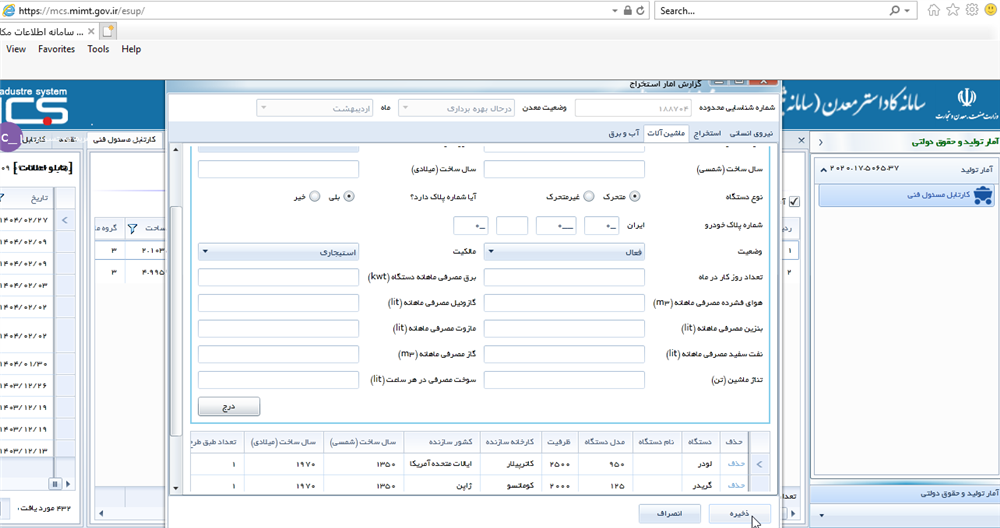 ورود اطلاعات مربوط به ماشین الات حاضر در معدن