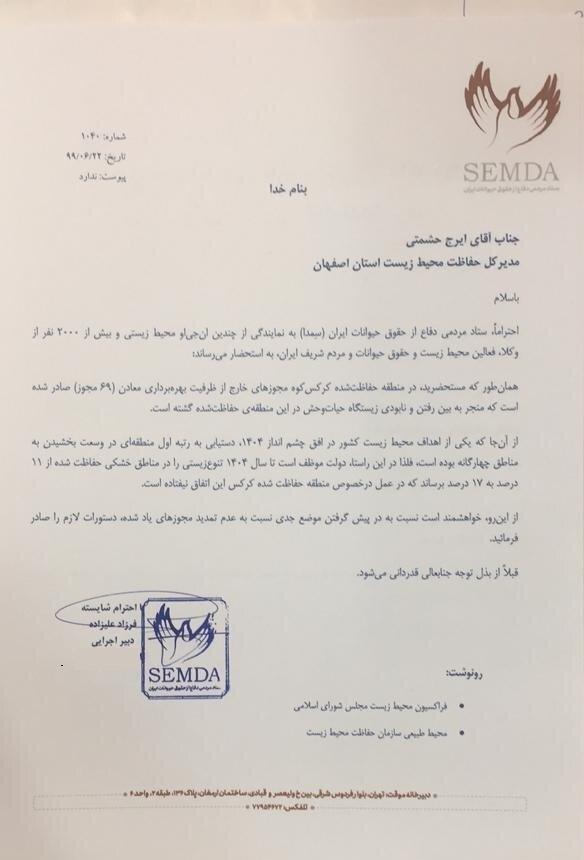 ثبت رایگان آگهی ستاد مردمی دفاع از حقوق حیوانات ایران (سِمدا) به نمایندگی از چندین سازمان مردم نهاد محیط زیستی و بیش از ۲۰۰۰ نفر از وکلا، فعالین محیط زیست و حقوق حیوانات در نامهای که خطاب به مدیرکل حفاظت محیط زیست استان اصفهان نسبت به صدور مجدد مجوزهای خارج از ظرفیت بهرهبرداری از ۶۹ معدن که منجر به از بین رفتن و نابودی زیستگاه حیاتوحش در منطقه حفاظتشده کرکس کوه میشود اعتراض کرد.